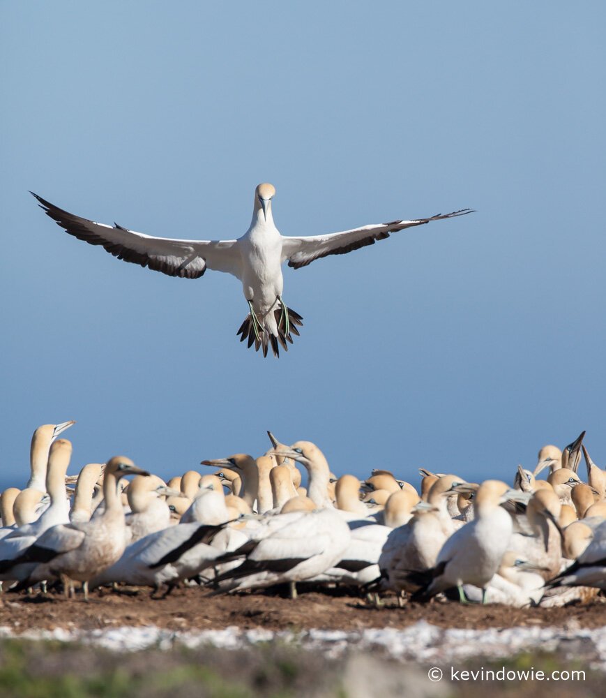 Bird Island, Lambert’s Bay, South Africa, where a Cape gannet prepares to land in the colony.