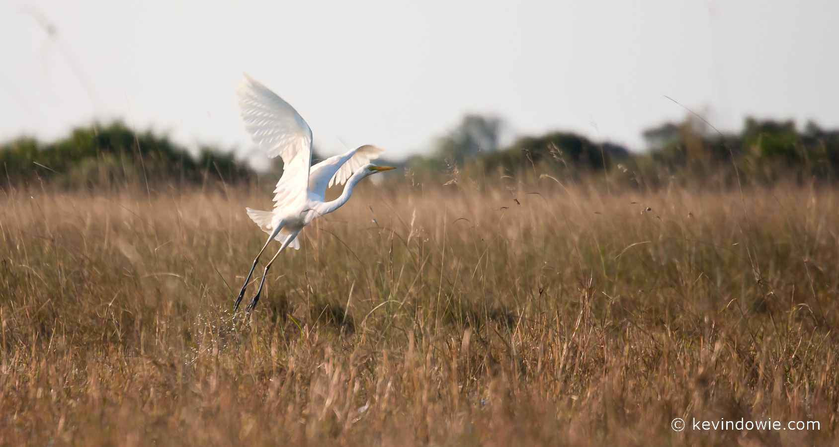 Cattle Egret taking off from reed bed, Okavango Delta.