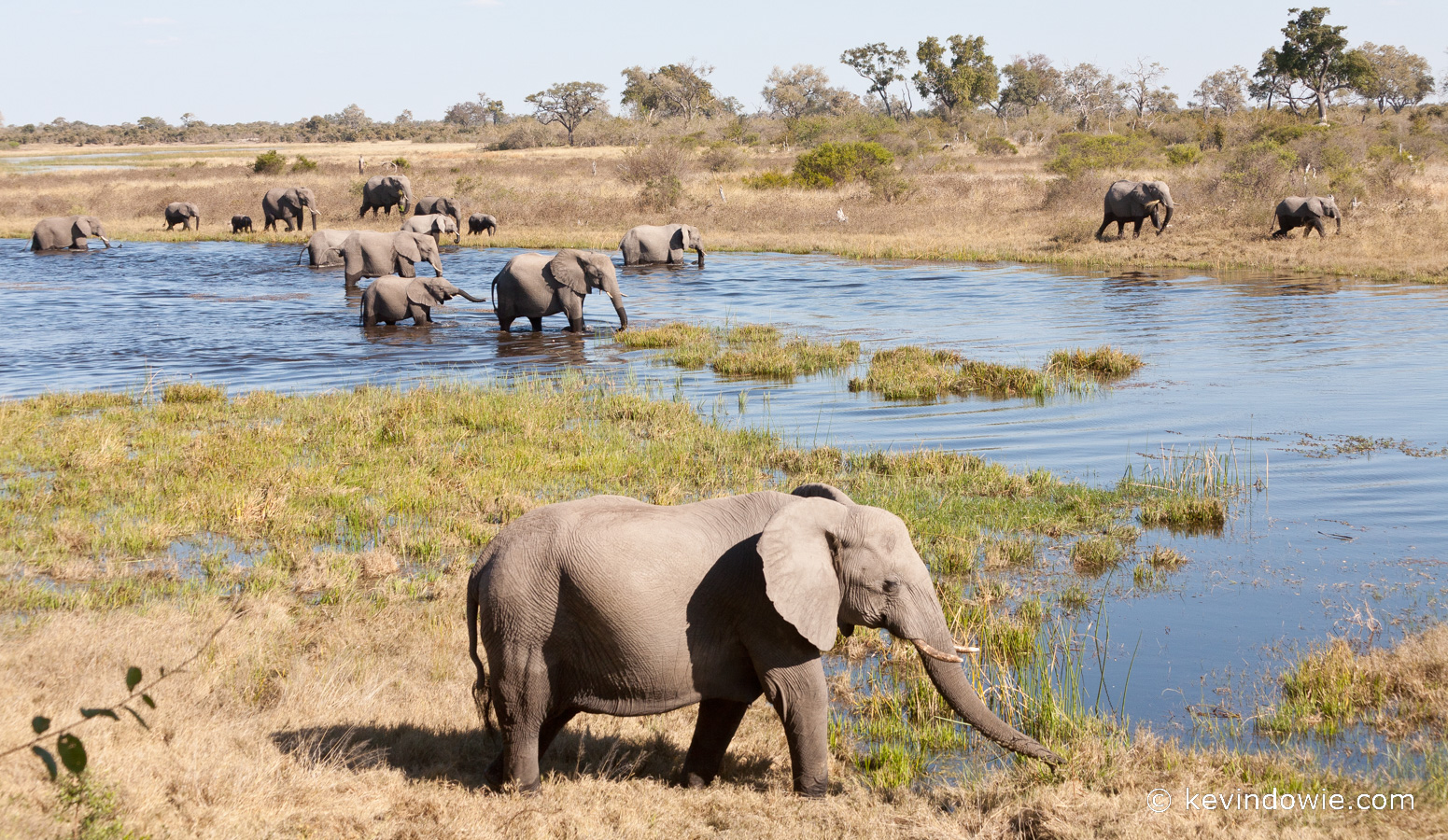 Elephant herd crossing Savuti Channel, Okavango Delta, Botswana.