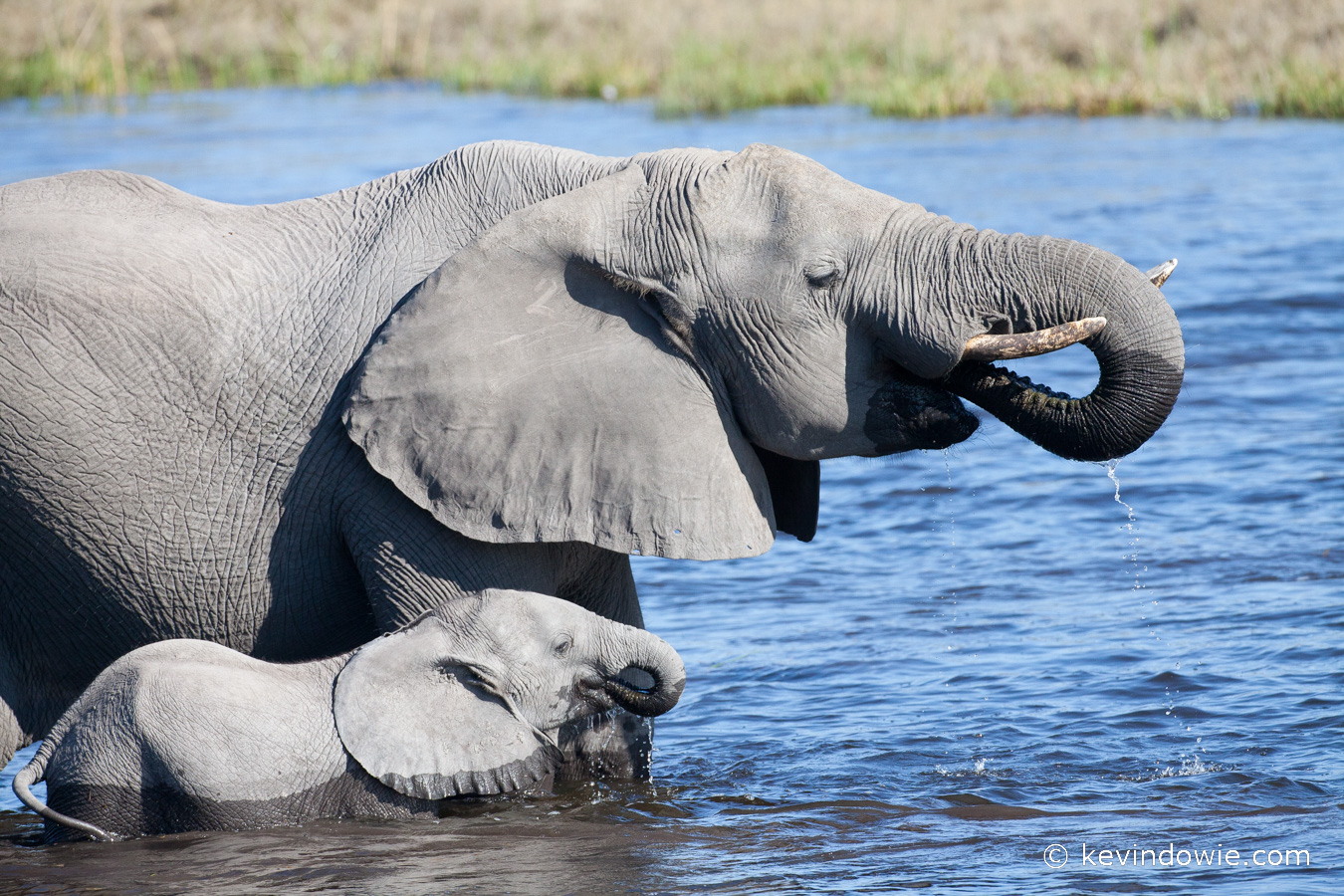 Elephant mother and calf drinking, Savuti Channel