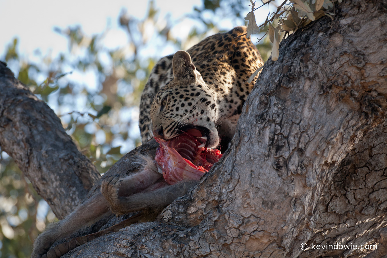 Leopard eating baboon, Okavango Delta, Botswana