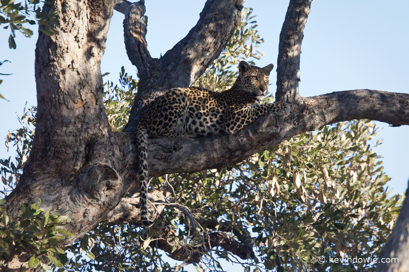 Leopard lying on tree branch, Okavango Delta, Botswana