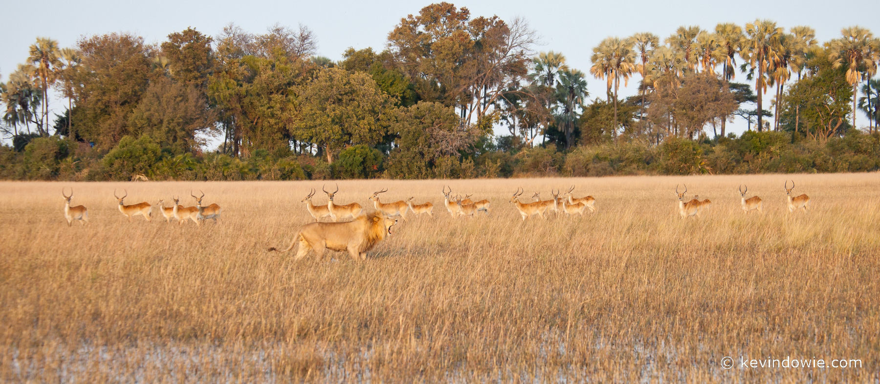 Lion and red lechwe, Okavango Delta, Botswana.
