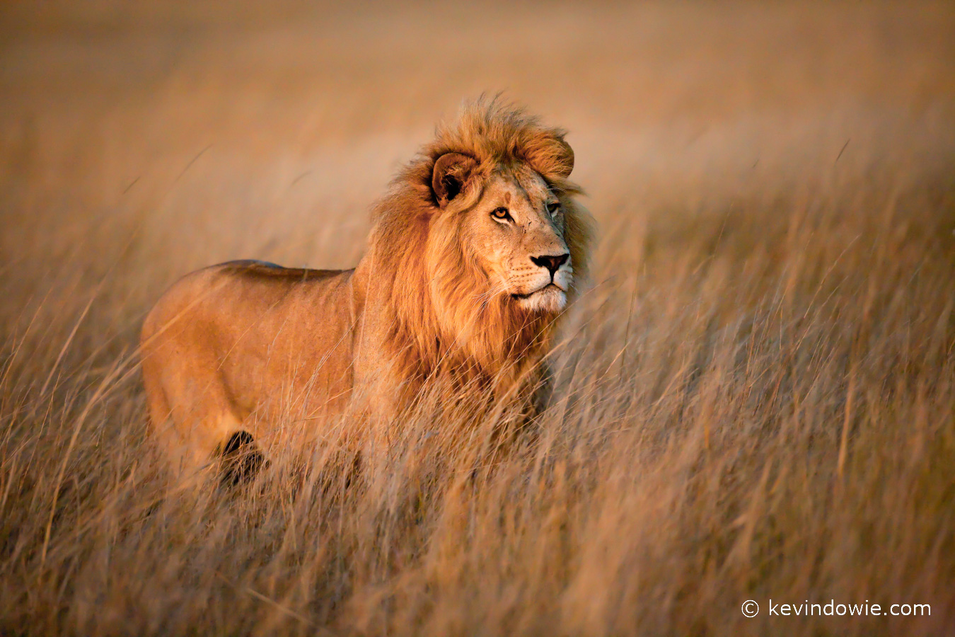Male lion on patrol at dawn, Okavango Delta, Botswana.