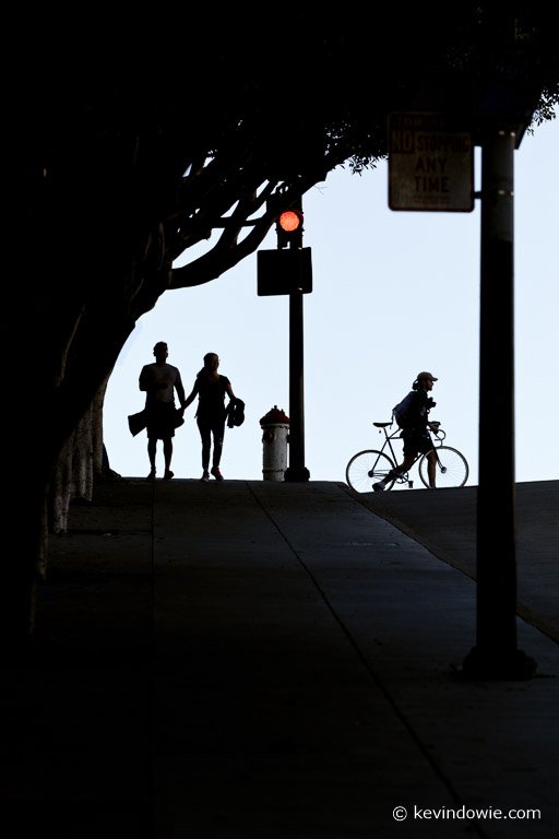 Standing on a street corner, I looked up one of San Francisco’s famous hills to see some people walking along the footpath towards the pedestrian crossing. Because of my low angle from the bottom of the hill, they had the sky as background. It was at this time that a man walked by wearing the classic cowboy or “ten-gallon” hat. Recognizing the value of such a distinctive shape, my immediate thought was, “if only I had my longer lens, this would make a killer silhouette”.